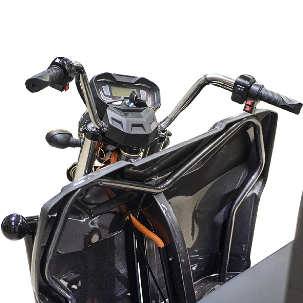 Грузовой электротрицикл Rutrike D4 NEXT II 60V1500W синий – мощная техника в презентабельном дизайне моментально привлекает внимание представителей бизнеса и фермеров. Объемный багажник, вместительное виденье, лучшие параметры удобства и комфорта заставляют внимательнее присмотреться к техническим характеристикам. Наш интернет-магазин предлагает купить электротрицикл по разумной стоимости. Каждому покупателю гарантирована бесплатная консультация, помощь в оформлении заказа. Модель оснащена мощным движком на 1500 Вт, который в сочетании с емкой батареей (от 55А*ч) обещает максимальный разгон до 25 км/час, которого хватает на преодоление дистанции до 80 км. Производитель обращает внимание, батарея не входит в комплектацию. Купить АКБ, подобрать максимально совместимую можно благодаря нашему интернет-магазину. Из других преимуществ производитель выделяет максимальную оснащенность функционалом. Техника оборудована зеркалами заднего вида, гидравлической амортизационной подвеской, информационным дисплеем. Имеется дополнительное место для пассажира. Широкая платформа для ног в сочетании с сиденьем исключает дискомфорт и проблемы с позвоночником. Широкие колеса (переднее х заднее - 3,50-R12 х 4,00-R12) отлично сцепляются с грунтом. Вместительный кузов размерами 3270 x 1200 x 1450 ДхШхВ – настоящая находка для предприимчивых личностей