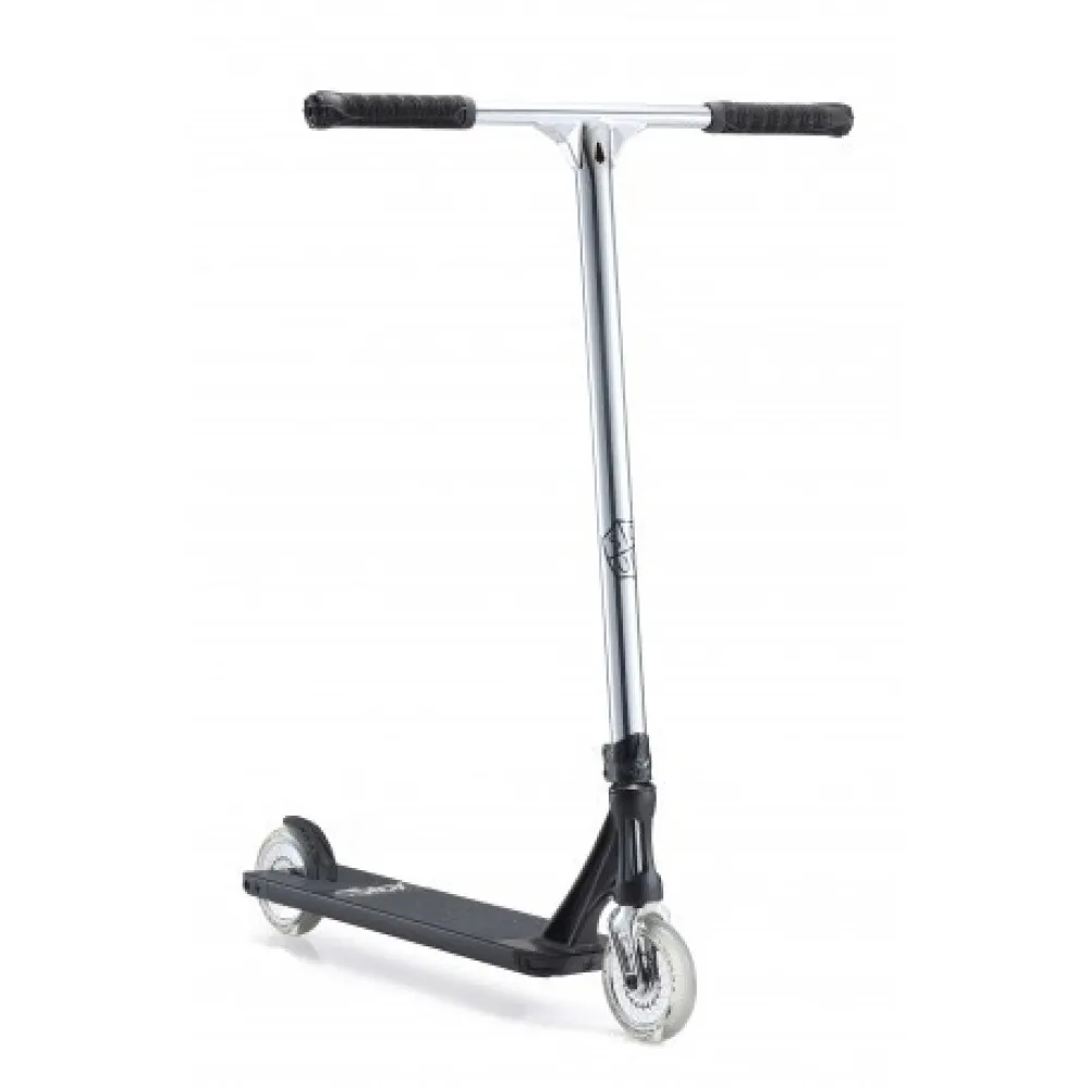 Техника рассчитана на пользователе весовой категорией до 100 кг. Т-образная форма руля изготовлена из инновационного алюминия. Оснащена нескользящими прорезиненными грипсами, благодаря которым увеличивается хват во время исполнения трюков. Колесная часть – полиуретановая, малостираемая, рассчитана на жесткую эксплуатацию.